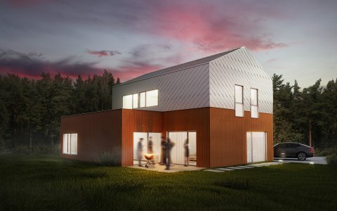 Jedná se o prostorný moderně navržený dům se sedlovou střechou o dispozici 6+kk a užitkové ploše 186 metrů čtverečních. Fasáda je ze dřeva ve dvou odstínech. Spodní část domu je v cihlovém odstínu a kosolamely jsou umístěny svisle, horní část domu je v odstínu bílém a kosolamely jsou umístěny šikmo.