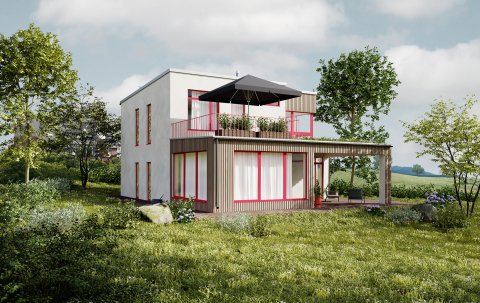 Tento dům je navržen v moderním stylu, kdy každá jeho část je navržena tak, aby zlepšovala funkčnost celého konceptu a zároveň, díky použití dřevěných prvků, ladila s okolní krajinou. Dům má působit moderním skandinávským dojmem. Fasáda je tvořená z dřevěných kosolamel a točené omítky. Na první pohled také zaujmou barevné okenní rámy, které domu dodávají šmrnc.