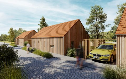 Krásný přízemní dům navržený v tradičním venkovském stylu s moderními prvky. Dům má tradiční sedlovou střechu s červeno-oranžovou barvou střešní krytiny. Fasáda domu je řešena moderním stylem s dřevěnými kosolamely namontovanými ve svislém směru. Díky technologii chemicky stařeného dřeva Vám, na rozdíl od jiných staveb, nebude časem fasáda domu flekatit. Doplňkové prvky domu, jako jsou okenní rámy a dveře, jsou navržené v přírodní barvě dřeva.